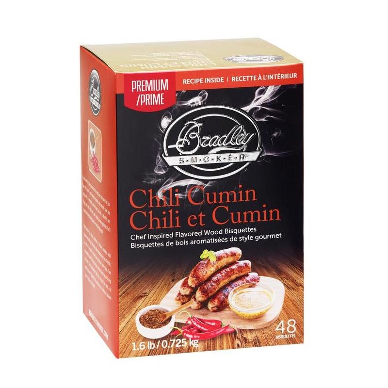 Balení udících briket Bradley Smoker Chilli Kmín pro elektrické udírny BradleyBalíček obsahuje celkem 48 udících briketHodí se k zauzení vepřového, drůbežího, hovězího masa, ryb, zeleniny a sýrů