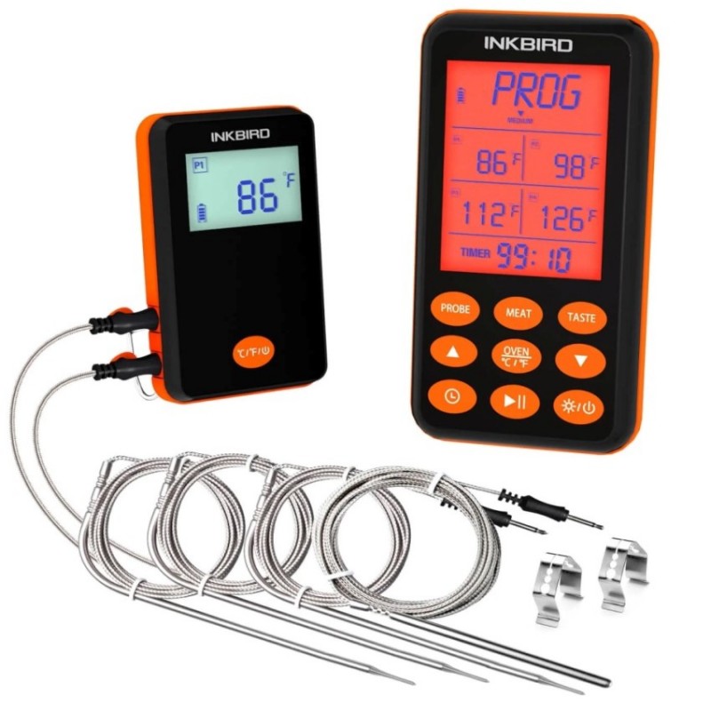 Dálkový digitální teploměr INKBIRD  IRF-4S s možností připojení až čtyř teplotních sond pro spolehlivé měření teploty        Automatické spárování se silným a stabilním bezdrátovým signálem (RF signál) s dosahem až 300 m ve volném prostoruNemusíte se obávat ztráty dat – automatické ukládání přednastavených hodnotÚdaje se zobrazují na velkém digitálním displeji, který je navíc podsvícený pro pohodlné grilování a uzení ve večerních hodinách