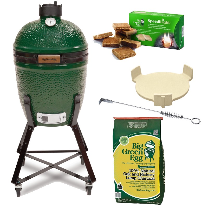 Proč si pořídit gril Big Green Egg Small v sadě Easy Start?    vše co potřebujeme ke grilování s grilem BGE Small v jedné krabici    výhodnější cena celého setu    jednoduché přemisťování grilu díky pojízdnému stojanu Nest    podpalovač pro zapálení uhlí bez příměsí lihu nebo petroleje    dřevěné uhlí Premium ze směsi dubu a Hickory co nečoudí    gril ve standardu vybaven keramickým konvektorem pro nepřímé pomalé grilováníB