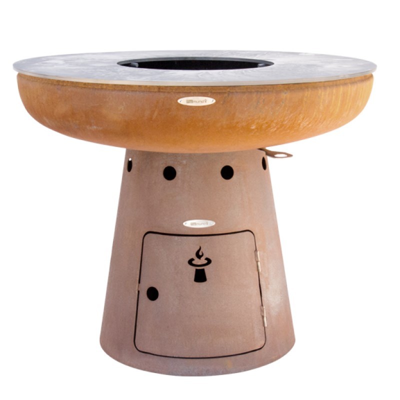 Robustní venkovní ohniště Remundi s kulatou grilovací plotnou pro celoroční grilování nebo jen příjemné posezení u plápolajícího ohněRustikální design zrezlého kovu dokonale zapadne do Vaší zahradyVysoká hmotnost (90 kg) zajišťuje výbornou stabilitu a tepelnou akumulaciJako palivo se používá kusové dřevo nebo dřevěné uhlíKe grilování slouží ocelová grilovací plotna vyrobená z 8 mm silné oceli o průměru 102 cm, kterou snadno rozpálíte až na 300 °CKo