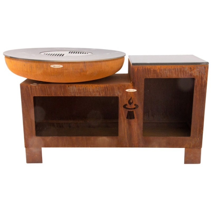 Robustní venkovní ohniště Remundi s kulatou grilovací plotnou, praktickou pracovní plochou a zásobníkem na dřevo pro celoroční grilování nebo jen příjemné posezení u plápolajícího ohněRustikální design zrezlého kovu dokonale zapadne do Vaší zahradyVysoká hmotnost (160 kg) zajišťuje výbornou stabilitu a tepelnou akumulaciJako palivo se používá kusové dřevo nebo dřevěné uhlíKe grilování slouží ocelová grilovací plotna vyrobená z 8 mm silné oceli o průměru 102