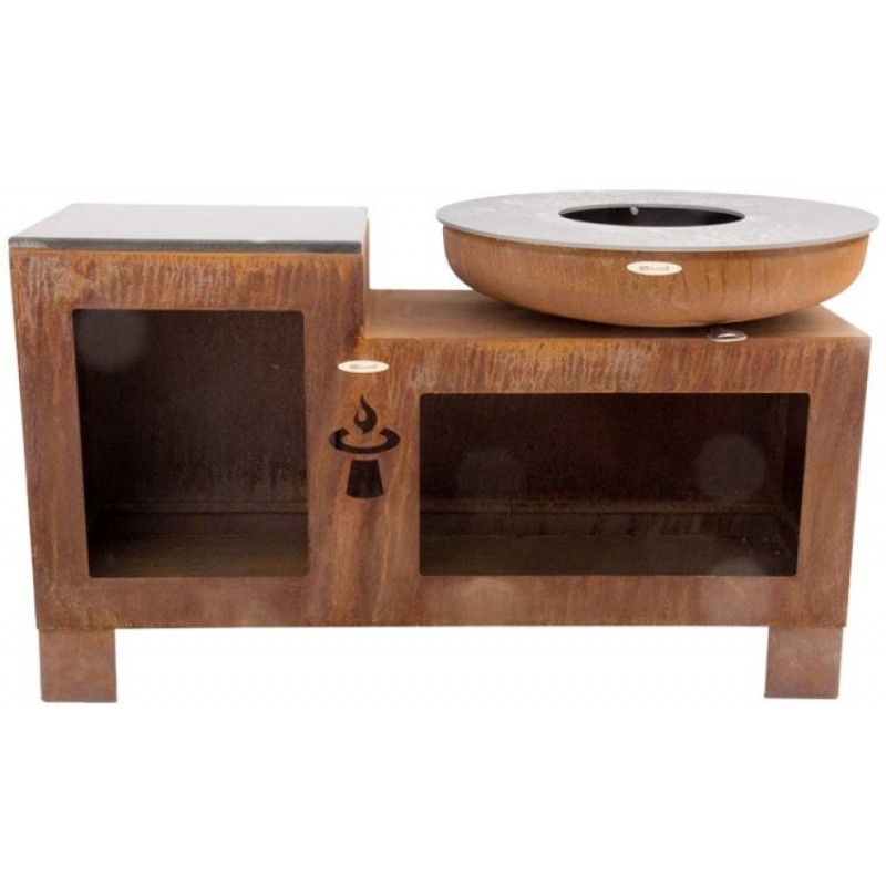 Robustní venkovní ohniště Remundi s kulatou grilovací plotnou, praktickou pracovní plochou a zásobníkem na dřevo pro celoroční grilování nebo jen příjemné posezení u plápolajícího ohněRustikální design zrezlého kovu dokonale zapadne do Vaší zahradyVysoká hmotnost (123 kg) zajišťuje výbornou stabilitu a tepelnou akumulaciJako palivo se používá kusové dřevo nebo dřevěné uhlíKe grilování slouží ocelová grilovací plotna vyrobená z 8 mm silné oceli o průměru 82 c