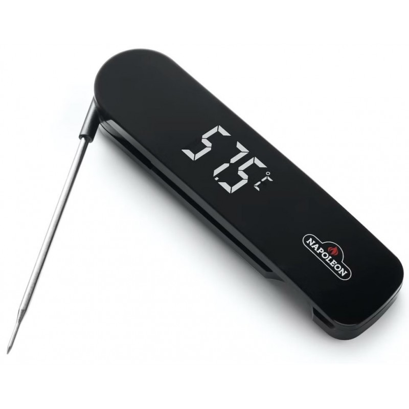 Velmi přesný digitální teploměr pro měření teploty v grilovaném mase od kanadského výrobce grilů NapoleonVýše naměřené teploty se zobrazí na velkém LED displeji během několika sekund po zastrčení sondy do masaTlačítko na podržení teploty – multifunkční tlačítko na zadní straně teploměru pro přepínání C°/F° a podržení naměřené teplotySkládací sonda teploměru je vyrobena z nerezové oceliAutomatické zapnutí/vypnutí teploměruOtočný displej – displej se