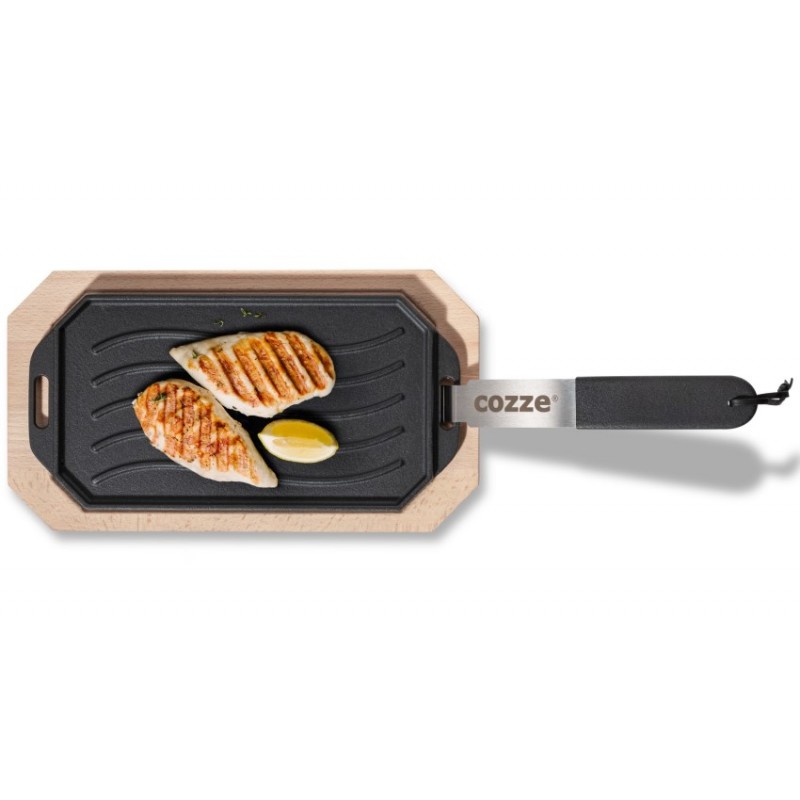 Litinová deska Cozze s dřevěnou podložkou vhodná pro pizza pece CozzeOboustranná deska s hladkým a vrkoubkovaným povrchem Deska se hodí na grilování steaků, mořských plodů a ryb, zeleniny, různých masových směsí, nebo na ní můžete udělat například vaječnou omeletu, lívance nebo palačinkyDřevěný tác perfektně poslouží při servírování či ochraně povrchu stolu pod litinovou deskouK litinové desce dostanete také nasazovací ergonomickou rukojeťRozměr sa