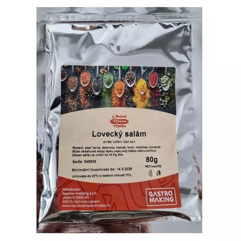 Kořenící směs na lovecký salám na 10 kg dílaDělejte lovecké salámy jako Mistr Málek – jeho vlastní recepturaSložení: pepř černý, dextróza, česnek granulovaný, kmín drcený, hřebíček mletý, koriandr mletýDávkování: 8g na 1kg – balení vystačí na 10 kg dílaPřed použitím řádně protřepatNeobsahuje sůl!