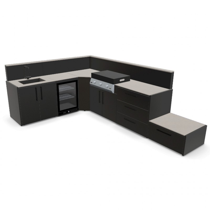 Modulární venkovní kuchyně Brabura Grills Comfort 01 v provedení Anthracite Grey s pracovní deskou Pietra di Luna je sestava navržená pro ty, kteří chtějí na zahradě skutečné zázemí pro venkovní vaření, grilování i servírování. Oproti základním konfiguracím přidává dřez pro pohodlnou přípravu surovin, integrovanou lednici pro nápoje a ingredience, rohový modul pro efektivní využití prostoru, plnohodnotnou planchu Brabura L-Class Original 30 a také základnu pro kamado g