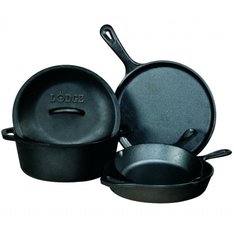 Multifunkční sada litinového nádobí Lodge Čistá litina bez jakéhokoliv chemického "nepřilnavého" povrchu a snese i extrémně vysoké teplotySada obsahuje:litinová pánev 20 cmlitinová pánev 26 cmlitinový hrnec 4,7 litrulitinová poklice na hrnec pánev na palačinky (nízký kruhový tál s madlem) 26cmLitina výborně drží teplotu, což je perfektní na steaky a ostatní jídla, která ke své přípravě v