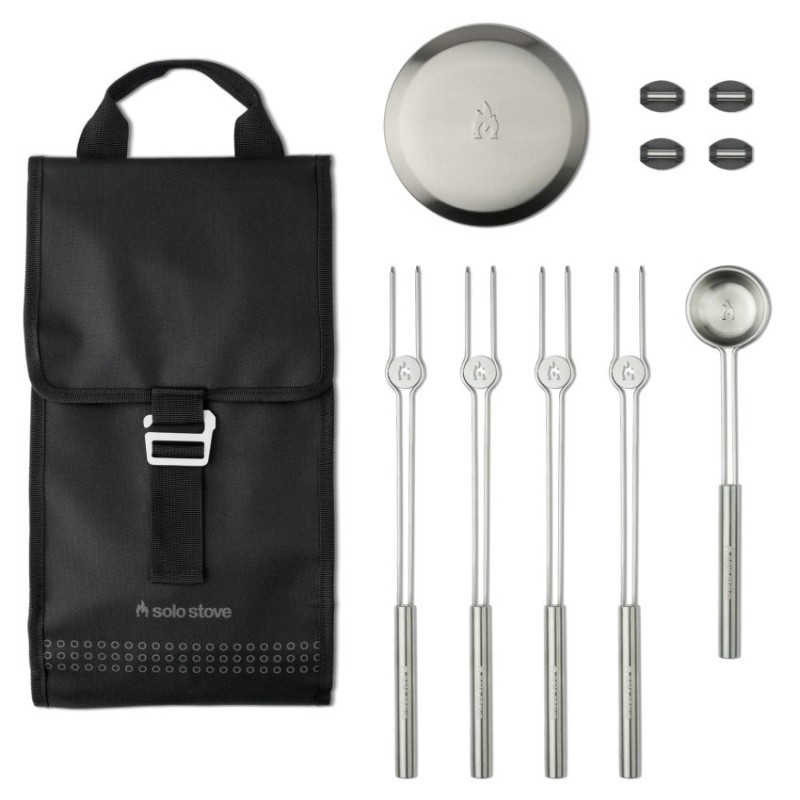 Sada příslušenství pro bezkouřová ohniště Solo Stove Mesa XLDíky praktickým pomůckám můžete své stolní ohniště využít naplnoSada příslušenství obsahuje:4x grilovací špíz s ergonomickou rukojetí perfektně padne do ruky4x praktické podpěry pro špízydávkovač pelet pro bezpečné přidávání do ohně během grilovánínerezové víko pro bezpečné uzavření žhnoucích uhlíků uvnitř ohništěpouzdro na příslušenství s prak