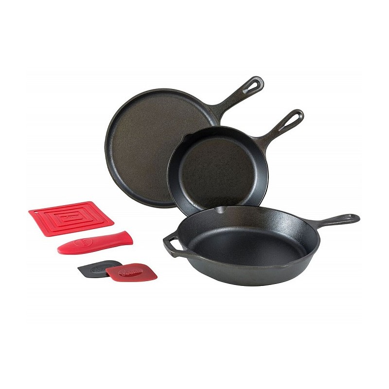 Cenově výhodnější set litinových pánví Lodge s praktickými doplňkySada obsahuje:Litinovou pánev 20 cmLitinovou pánev 26 cmLitinovou pánev na palačinky 26 cm