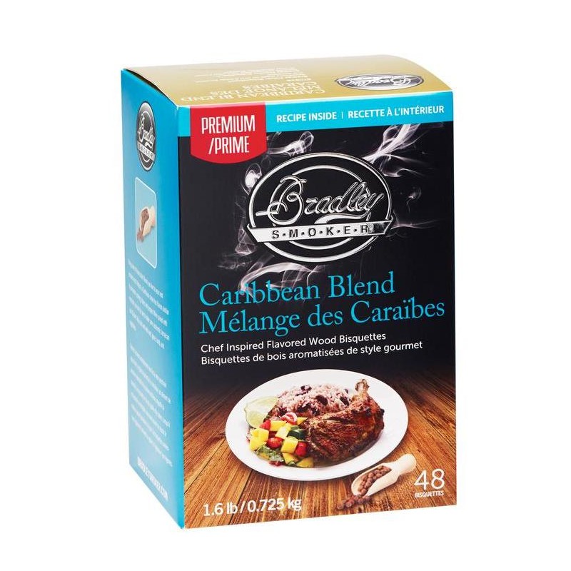 Balení briket Bradley Smoker Caribbean pro elektrické udírny BradleyHodí se k uzení hovězího, jehněčího a drůbežího masa, ale použít se dá také na zeleninuBrikety jsou vyrobeny ze dřeva mesquite, nového koření a vláken z karibských dřevinJeden balíček obsahuje celkem 48 ks udících briket