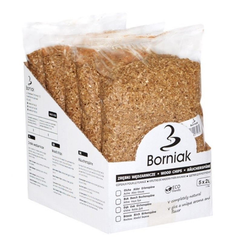 dřevěná udící štěpka pro elektrické udírny BorniakBalení obsahuje celkem 10 litrů udící štěpkyUniverzální příchuť pro různé druhy masa, ryby i pro sýry a zeleninu