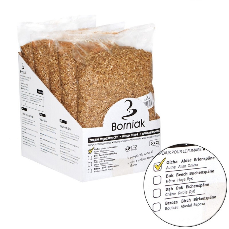 Dřevěná udící štěpka pro elektrické udírny BorniakBalení obsahuje celkem 10 litrů udící štěpkyOlšová příchuť je velmi univerzální a hodí se ke všem druhům masa, také k rybám a zelenině
